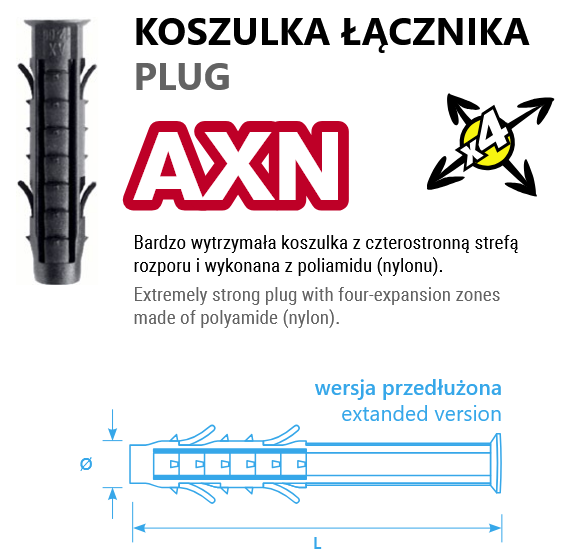 Koszulka kołka AXN 14x70 T marki STARFIX to wyjątkowo wytrzymały element montażowy wykonany z odpornego na starzenie i odkształcenia poliamidu (nylonu PA 6.6). Dzięki czterostronnej strefie rozporu zapewnia stabilne i pewne mocowanie w większości popularnych podłoży budowlanych — od betonu, przez cegłę, po gazobeton i płyty g-k.